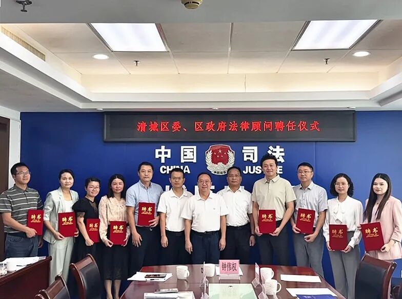 ▲钟伟权同道为新一届区委、区政府法律参谋人颁发聘书