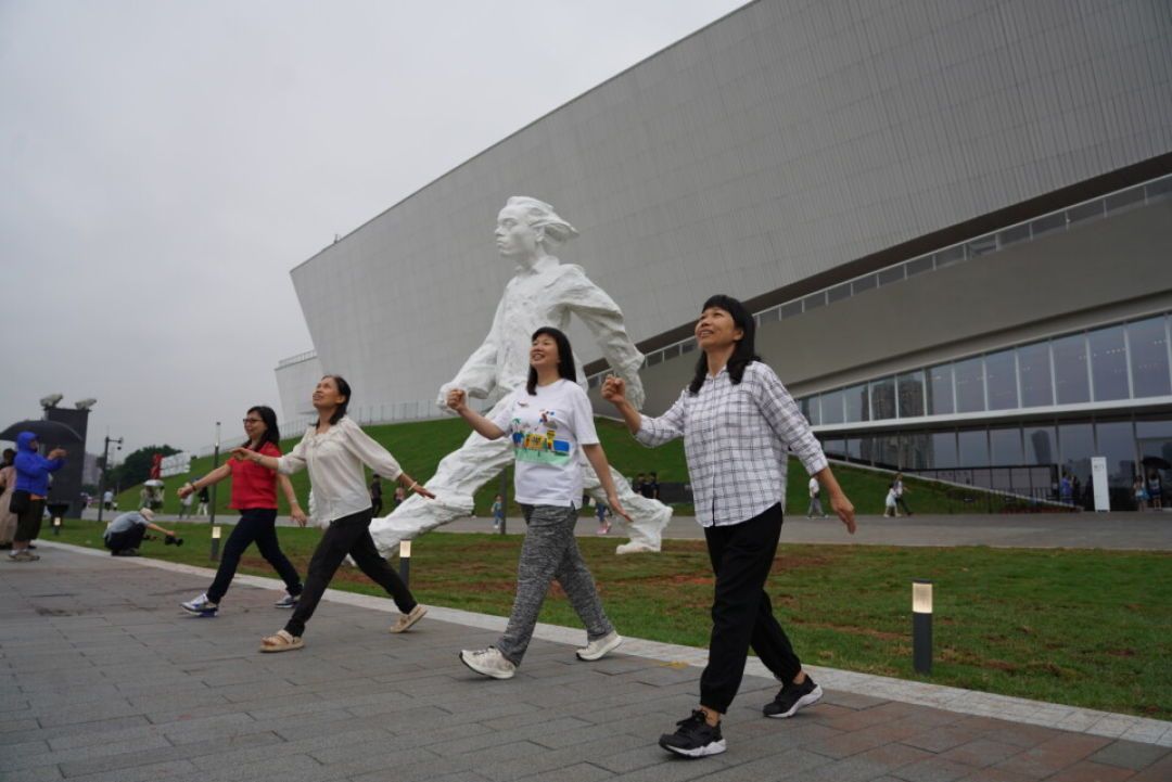 几位不雅众摆出与广东好意思术馆新馆的雕刻相同的动作,合照眷恋。