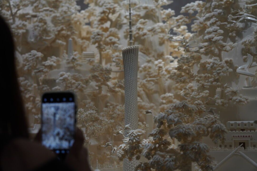 白鹅潭大湾区艺术中心广东非遗馆中,不雅众在拍摄骨雕展品。