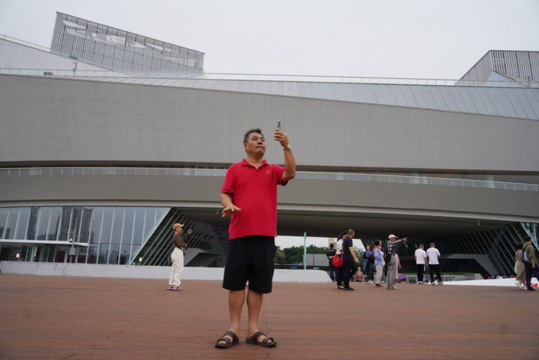 开馆首日,搭客在白鹅潭大湾区艺术中心外拍照眷恋。