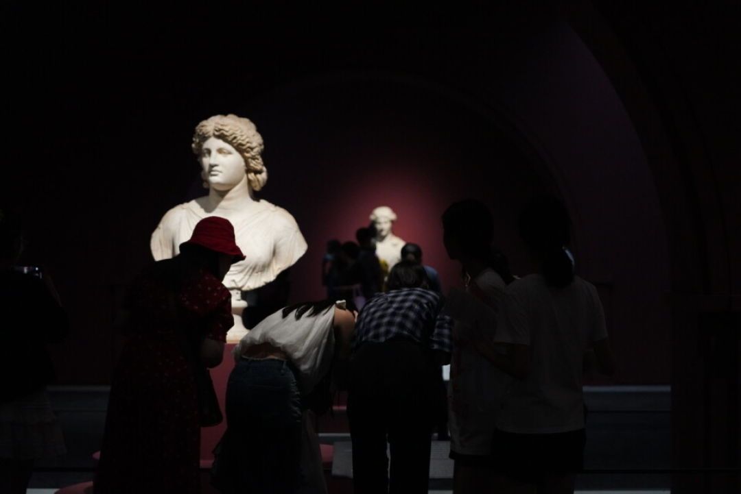不雅众在广东好意思术馆“凝固的诗篇——博尔盖塞好意思术馆藏文艺恢复至巴洛克时候精品展”的雕刻前立足不雅看。
